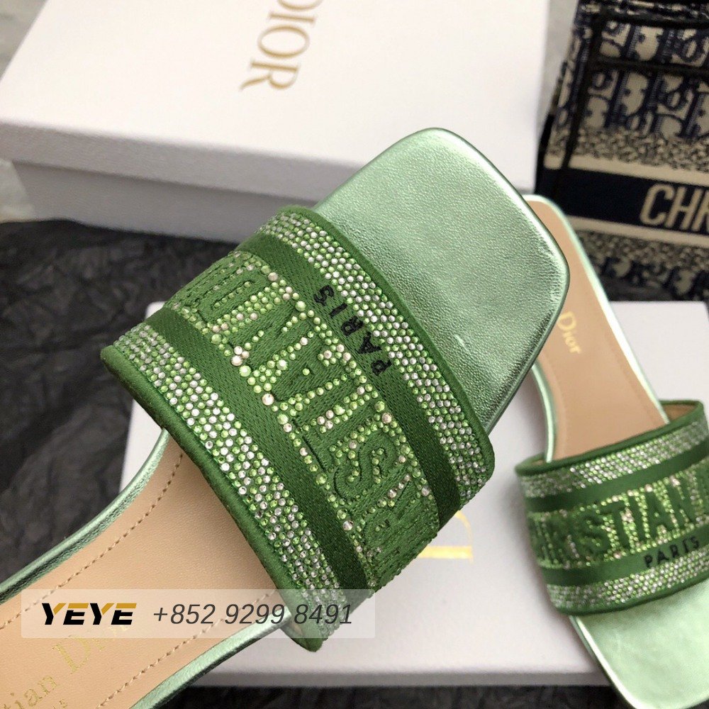 Dior Dway Heeled Slide Green Cotton Embroidered with Metallic Thread and Strass